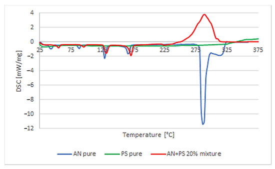 Figure 6. DSC analysis of pure AN, pure polystyrene (PS), and their mixture (20%), heat rate 10 °C/min.