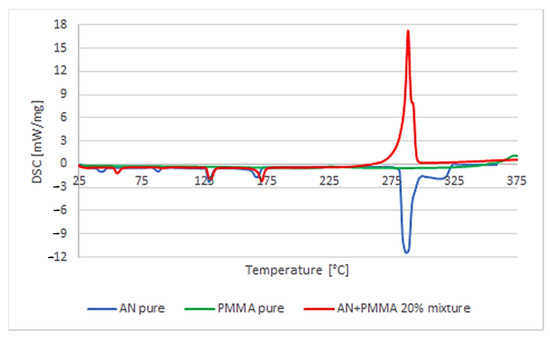 Figure 8. DSC analysis of AN, PMMA, and their mixture (20%), heat rate 10 °C/min.