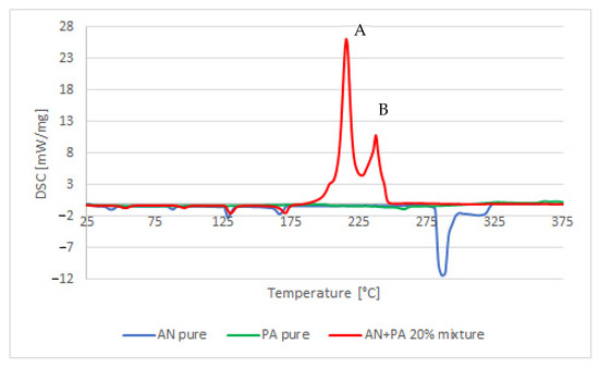 Figure 10. DSC analysis of pure AN, pure PA, and their mixture (20%), heat rate 10 °C/min. Enthalpy of the mixture decomposition process ΔHA = −1033 J/g, ΔHB = −387 J/g (values of A and B reactions are given in Table 5).