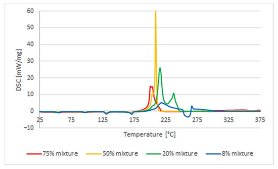 Contrary to the previously described substances, explosive properties were observed in the case of a mixture containing 8% by weight of polymer. The enthalpy of the decomposition reaction was −681 J/g. Due to the abovementioned high melting point of PMMA, the initiation of the decomposition reaction did not change significantly and took place at a temperature of about 287 °C. The temperature was slightly reduced (280.8 °C) for a mixture containing 50% of polymer. For PMMA, the enthalpy of the decomposition reaction was the lowest among the measured polymers and amounted to −629 J/g (Table 4). Clear splitting of chemical reactions constituting the stages of the decomposition reaction was noteworthy. The results of the measurements showed that, for each of the analyzed polymer contents in the mixture, its thermal decomposition was explosive (Figure 10).
