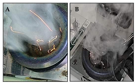 Figure 13. Furnace with an open nickel-measuring crucible gradually heated (10 °C/min). The compacted samples of 20% uPVC (hard)/AN (A) and 10% carbon/AN (B) were placed in the crucible.