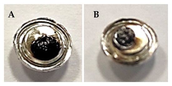 Figure 14. DSC 25-µL measurement vessels with a lid with a hole of 0.3 mm in diameter. Vessels after experiments (see Figure 13). Weight of each of the samples was ~5 mg (A and B have the same meaning as in Figure 13).