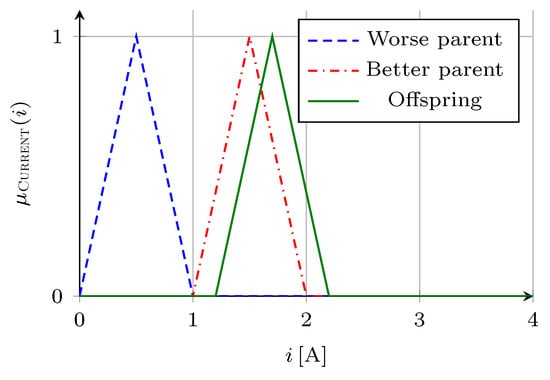 In the introduced example the parents are shifted to the two sides in order to visualize the deviation. The fitness value of the better parent is 80% better than that of the worse parent, that is why, the offspring is much closer to the the better parent.