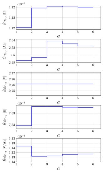 The output voltage of the battery taking into accout the temperature dependency of the parameters can be written by Equation (