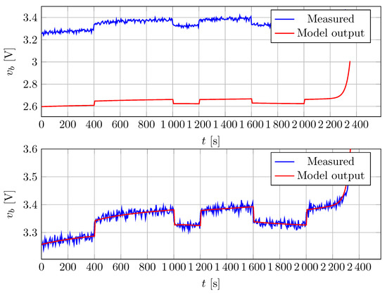 The measured battery voltage and the battery model output voltages for the initial parameter set (top) and after the last (sixth) parameter estimation step (bottom).
