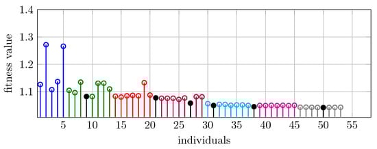 Fitness value of the different individuals along the generations. The different colors denote the different generations. The first group is the initial generation with five individuals. In each generation, the individual with the best fitness value is denoted by black filled marker. (five element initial population, ,  and ).