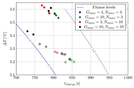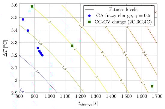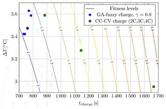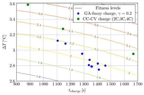 The contour lines represent the fitness surface over the  plane for . Blue dots represents the real battery data corresponding to the charge process using the fuzzy charge controller generated in each generation of the genetic algorithm. Square markers denote the performance of the conventional CC-CV charging profiles with 2C, 3C and 4C respectively.