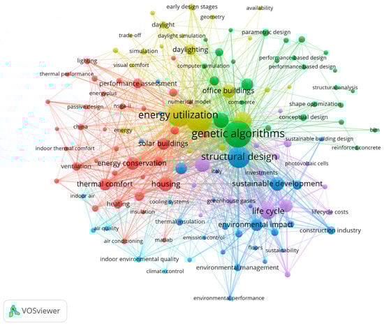 A synthetic review was conducted to investigate the applications of MOO models to integrated building design. Scientific journal articles that focused on the optimization of building and neighbourhoods’ performances (i.e., energy and environmental impact, thermal and visual comfort, solar accessibility) were reviewed. Two databases were considered as the sources to find these journal articles: Scopus and Web of Science (WoS). These were chosen as they return literature from highly reliable sources with wide geographic coverage. Identical search terms were used in both the databases, whereas the research to acquire relevant journal articles was conducted in three steps. Initially, the “building”, “multiobjective” and “optim*” terms were searched in titles, abstracts, and keywords from papers collected in the two databases (step one). The Boolean Operator “and” was used to connect the search fields in all databases to ensure consistency of searches. The chosen search terms were found in around 2690 and 4180 journal articles in Scopus and WoS, respectively. The order of the terms within a search field was found to not alter the returned literature: for example, “building multiobjective optimization” and “multiobjective optimization building” returned the same publications. However, this search was deemed ineffective as it returned a wide range of literature with topics not pertaining to the exploitation of MOO models in the integrated building design. To narrow the results, the terms “design” and “architectur*” were used together with “building”, “multiobjective”, and “optimiz*” to acquire a focused set of literature for reviewing (step two). Search terms were refined with the help of the VOS Visualizer tool with the aim of providing a view of how MOO models are used throughout the building design process with an emphasis on architectural applications. Indeed, this machine learning-based tool ranks the words in the titles, abstracts, and authors’ keywords of the collected scientific journal articles and then applies clustering models to classify the most used words in groups (Figure 1). The consequent density visualization provided a quick overview of the main areas in the bibliometric network highlighting the presence of journal articles about optimization of mechanical components of systems and plants (i.e., turbines, engines, compressors). To further narrow the results, the typology of the scientific journal articles to be included in the present review was defined as “article”, thus excluding conference proceedings, books, and other review studies (step three).
