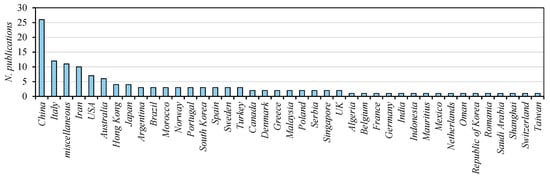 Most of the investigated case studies were located in China (26), Italy (12), and Iran (10) (Figure 3). Alongside these, up to 11 journal articles evaluated the effectiveness of the proposed MOO models at various latitudes through comparative analyses (“miscellaneous” category). Less than 10 publications were found for the other locations.