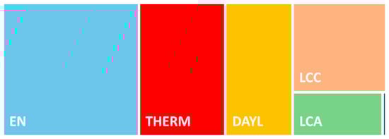 Implemented GAs were mostly used for solving optimization problems with two (92) and three objective functions (43). Only six publications proposed the simultaneous optimization of more than four variables. Enhancing building’s energy performance levels (EN category in Figure 5) was included among the research goals of more than one hundred studies (115), whereas guaranteeing adequate thermal and visual comfort conditions (THERM and DAYL categories in Figure 5) was searched by authors of 73 and 57 journal articles, respectively (Figure 5). Finally, up to 53 studies aimed at minimizing life-cycle costs and other economical parameters (LCC category in Figure 5), whereas only 25 studies evaluated life-cycle emissions (LCA category in Figure 5).
