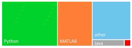 Programming languages utilized to write the MOO algorithms in the reviewed journal articles. A larger area corresponds to a higher number of algorithms based on that programming language. The “other” category also includes those journal articles which did not declare the programming language.