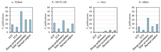 Figure 8c shows that Java-based MOO workflows were not applied to the optimization of life-cycle costs and emissions. On the contrary, solar accessibility, thermal comfort, and energy performance were investigated in 3, 4, and 5 publications.