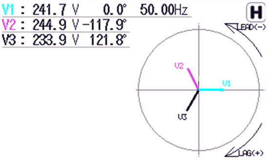 The low voltage distribution system is characterized by the fact that a large number of receivers with various characteristics are connected to it [12]. Most of the devices connected to the grid are single-phase loads. An increasing number of them have power systems which are based on electronic converters [13]. The use of this technology results from the requirements regarding their dimensions, weight, and price. The major problem arising from the use of such converters is the fact that they consume current in a non-linear manner [14]. An additional problem is the reactive power demand. Due to the presented factors, the parameters of the power grid deteriorate [15,16]. Phase-to-phase asymmetry appears, the voltage total harmonic distortion (THD) in the grid increases, and the increasing amount of reactive power reduces the grid capacity and causes voltage drops. The parameter that also changes is the phase angle between the voltage vectors. The measurements in the low voltage networks with a large number of consumers show that the phase angles are not symmetrical. Figure 1 and Figure 2 show the measurements made using Kyoritsu KEW6310 (Kyoritsu, Tokyo, Japan), which is power quality analyzer.