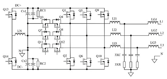 The proposed solution is a four-wire AC/DC converter (Figure 4). Its construction is based on a three-level T-type topology [20,21,22]. The fourth branch acts as a neutral wire and it enables phase-independent reactive power compensation. This solution is realized by a serial connection of Cx1 and Cx2 capacitors. As a result, the DC bus voltage is split in two. The application of increased capacity on the DC bus improves the operation of the system in dynamic states. In this context, the use of supercapacitors may be considered [23,24]. LN inductance is connected between neutral point and Q13–Q14 transistors. This connection allows for the active voltage stabilization on split DC bus. The inductive-capacitive-inductive (LCL) filter is used at the output of the converter, tuned to eliminate interference from the switching transistors.