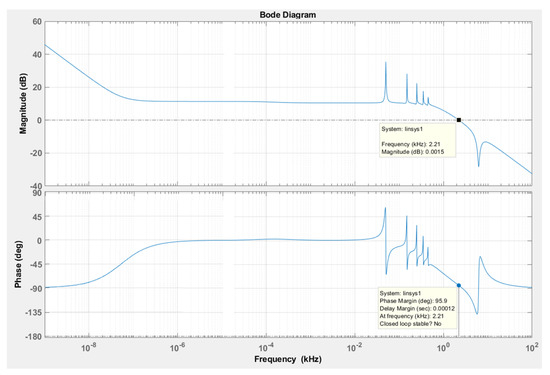 On the basis of the transfer function (2), the Bode plot of the control system in conjunction with the LCL filter has been determined (Figure 8). Bode plot analysis shows that constant and slow-varying signals are integrated. The system response to the signals characterized by frequencies which are slightly below 50 Hz is purely proportional. Bode plot peaks correspond to the fundamental frequency PR controller and its odd multiples. The system also has a low-pass filter with an additional notch filter [32], which is tuned to eliminate the peak at the resonance frequency of the LCL filter.