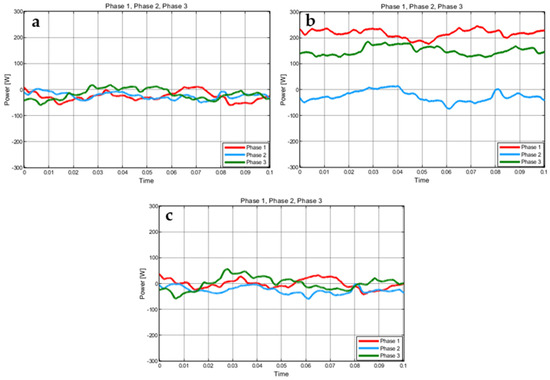 For the simulation tests, a microgrid with single-phase loads and an AC/DC converter operating in the reactive power compensator mode was modeled. The active power reference was equal to zero in all simulation cases. In the first case, the oscillogram (Figure 9a) showed the power delivered by the converter to the symmetrically loaded microgrid. For synchronization purposes, the system with standard three phase-based PLL was used (Figure 5a). The active power delivered by the converter was close to zero. In the second case (Figure 9b), resistive, inductive, and capacitive loads were connected to the individual phases of the microgrid, which resulted in voltage unbalance. As in the previous case, a standard PLL was used for synchronization (Figure 5a). The converter’s output power was close to zero in the first phase, approximately 150 W in the second phase, and slightly over 200 W in the third phase. The third oscillogram (Figure 9c) showed the case where the loads remained the same as in the second case but the synchronization method was changed by introducing three individual PLLs (Figure 5b). As a result, the active power flow generated by the converter in all three phases was close to zero. It can be clearly stated that the synchronization system based on three individual PLLs has a good level of performance in the state of voltage unbalance.