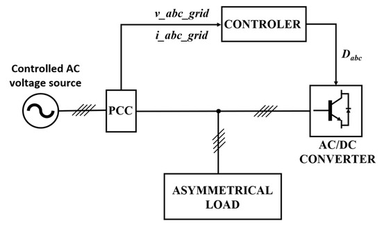 One of the main challenges of today’s electrical power engineering is the symmetrization of grid voltages and minimization of reactive power flows in distribution networks. There are many negative effects associated with asymmetry in power systems, such as increased losses in electric motors, harmonics transferred to DC systems, or phase currents inequality [1]. The research on four-wire converters and voltage asymmetry compensation methods in the distribution networks has already been carried out. The solution presented in [2] describes the control method for inverters, which is characterized by resistive behavior for grid disturbances. Voltage distortions are also inextricably linked with the load unbalances. There are proposals of load compensation under distorted voltages that are based on instantaneous symmetrical component theory with positive sequence extraction [3] or differentially rotating reference frame systems [4]. Other approaches are connected with neutral current compensation [5,6] and fuzzy neural networks [7]. However, the problem that has not been addressed in the research publications is the correlation between the asymmetry of phase angles and the reactive power compensators output power factor. It should be emphasized that non-linear and asymmetric loading of distribution networks [8,9] causes significant voltage asymmetry but also the phase angle shift. This problem is exacerbated in the systems where the short-circuit impedance is high—we can definitely include microgrids among them [10,11]. For the aforementioned reason, it is required to develop methods of controlling active and reactive power in the microgrid asymmetry states, which will be immune to the angular asymmetry between voltage vectors.