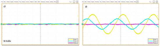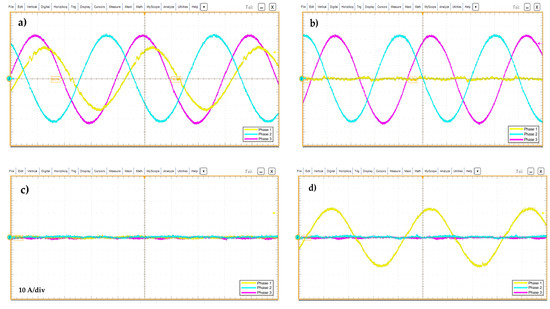 In the second test, due to the capacitive load in the first phase and inductive load in the second phase, the flow of reactive power in these phases was detected (Figure 13a). The third phase load was resistive, therefore all the power given off by the programmable AC source in this phase was active. Reactive power compensation reduced the reactive currents flow from the programmable AC source to almost zero. The fulfilment of this condition allows for reducing the flow of reactive power at the output of the converter in an idle state to zero (Figure 13c). The reactive current flow, forced by the converter (Figure 13d), fully covers the demand of the loads, thus the programmable AC source does not have to transfer any reactive power to the load.