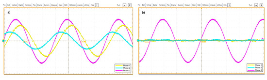Figure 14 presents the comparison between two considered synchronization methods from the grid perspective. It is worth noticing that in Figure 14a, the active power is non-zero in individual phases. The converter generated 74.8 W in the second phase and 28.6 W in the third phase. This is due to the use of the standard three phase-based synchronization method. This test is an empirical confirmation of the simulation that included the operation of the converter with the above-mentioned synchronization algorithm (Figure 9b). In the simulation, the active power delivered by the inverter was greater than in the test result because a deeper angular asymmetry was modeled. This is an undesirable situation because the active current can discharge AC/DC converter capacitors and then drain the power from prosumer energy storage. On the other hand, when the improved compensation algorithm was applied (Figure 5b), the active current from the output of the power converter is almost zero; this is preferred situation because the active and reactive current is measured without the error caused by phase angle unbalance (Figure 14b). Simulation studies also showed high effectiveness of the improved synchronization method in reducing undesirable active power flow. Despite the small error of angles between voltage vectors, the active current is almost negligible and discharging of the capacitive DC-link or prosumer energy storage does not occur. The use of the proposed compensation method reduced the error of active power output by 97.97%.