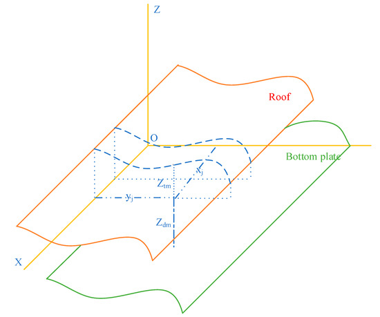 Figure 1 is a simple schematic diagram of Formulas (7)–(9). Roof represents the roof of the coal seam, Bottom plate represents the floor of the coal seam, xj represents the coordinates in the x-axis direction of the j-th projection point, and yj represents the coordinates in the y-axis direction of the j-th projection point. Ztm, Zbm are the elevation of the top plate and the elevation of the bottom plate corresponding to the m-th grid point in the neighborhood.