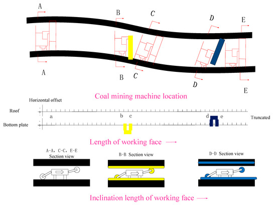 Figure 2 shows the schematic diagram of the shearer memory cutting technology. When the shearer is located at A-A in the figure, it means that the shearer drum is normally cutting coal. When the shearer is located at B-B in the figure, it means that the position of the shearer drum is lower. Through the shearer memory cutting technology, the height of the drum is automatically adjusted to the normal coal cutting state C-C of the shearer drum. When the shearer is located at D-D in the figure, it means that the position of the shearer drum is on the upper side. Through the shearer memory cutting technology, the height of the drum is automatically adjusted to the normal coal cutting state E-E of the shearer drum. Through a variety of sensors in the body of the shearer to realize the shearer’s mining height, speed and other data acquisition, the shearer self-positioning device was developed to achieve the shearer cutting process of automatic control. Additionally, the memory is carried out in the control program database to realize the learning of “demonstration knife”, and realize the shearer automatically cutting coal according to the memorized curve and technology in the next cycle process, and finally realize the memory cutting [42]. Fan Qigao et al. [43] corrected the grey model by using the Markov chain state probability matrix, and obtained the adaptive adjustment value of shearer cutting height, which greatly improved the automation level of the shearer. Zhang Lili et al. [44,45] used a genetic algorithm or particle swarm algorithm to optimize the memory cutting path of shearer. The experimental results show that genetic algorithm or particle swarm algorithm can quickly and effectively realize the path optimization of the shearer under a complex geological environment, which is beneficial to the memory cutting and automatic control of the shearer.