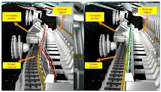 Figure 3 shows the structure diagram of the Inertial Navigation Straight Finding System. Figure 4 shows the schematic diagram of the automation of hydraulic support and machine. The left side of Figure 4 shows the shearer that is cutting coal. At this time, the red line indicates that the scraper conveyor is in a curved state. The automatic follow-up of the hydraulic support is used to automatically straighten it, so that the straightening of the scraper conveyor on the working face is as shown in Figure 4. With the green line on the right, the working face has moved forward. At present, the intelligent hydraulic support with independent intellectual property rights in China has been equipped with the action of following the automatic advancement and automatic support of the shearer, and has realized some intelligent functions, including automatic frame shifting, automatic follow-up, automatic incline adjustment, automatic straightening, intelligent liquid supply, self-testing mine pressure, automatic pressure compensation and centralized control of roadways, etc. [46]. The intelligent control technology of the hydraulic support is real-time control through remote intervention of the hydraulic support, using the monitoring data of the hydraulic support and the visual monitoring technology of the video follower to realize the automatic transfer of the hydraulic support, automatic follow-up, automatic incline adjustment, straightening and other functions.