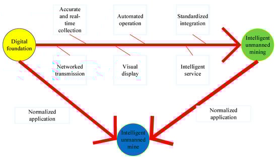 Figure 9 shows the overall design framework system diagram of intelligent unmanned mining. A unified 4DGIS, virtual mine and configuration software platform was used to manage the spatial data and attribute data of the entire safety production process of “mining, excavation, machine, transportation, and communication”, using a unified GIS, three-dimensional visualization or virtual mine platform [58]. For the integrated automation system, a unified configuration software platform is adopted; production mine operation management, safety production online inspection management, safety production technology comprehensive management, and decision support adopts a unified management platform to achieve the height of the software and hardware system integrated operation, analysis and management; unified data transmission, underground enterprise management, integrated automation, online inspection, and integrated management of safe production uses a unified network for transmission; unified data warehouse, production mine operation management, integrated automation, safe production online inspection management, comprehensive management of safety production technology, and decision support adopt a unified data warehouse to realize data sharing [59,60,61].