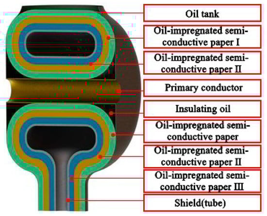 The IOCT insulation system is composed of an oil-impregnated insulating paper layer and a semi-conductive paper inserted into the electric screen (collectively referred to as the insulating layer below), where the outermost layer is a high potential, and the innermost layer is ground potential. The cross-sectional view of the ring structure is shown in