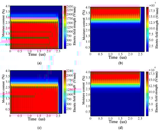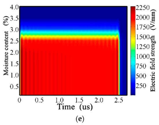 Figure 6 that, when the water content of the IOCT insulation system is less than 2.6%, the electric field strength is mainly concentrated in the oil-immersed insulating paper, and the maximum value appears in the oil-immersed insulating paper III at 0.5 μs, which is 2476.49 V/mm; on the contrary, when the water content of the IOCT insulation system is higher than 2.9%, the maximum electric field strength appears in the semi-conductive paper II at 0.6 μs, which is 18.9 × 104 V/mm; when the water content of the main insulation is between 2.6% and 2.9%, the electric field strength of the insulating layer is evenly distributed between the oil-impregnated insulating paper and the semi-conductive paper. It can be seen that the moisture content of 2.6% is the inflection point that affects the electric field distribution of the IOCT insulation system. With the change of moisture content, the most violent change in electric field strength appears in oil-impregnated insulating paper I. At 2.5 μs, the electric field strength of oil-impregnated insulating paper I, with a water content of 4%, is at a water content of 0.1%. It can be seen, 2.3 × 107 times, that the influence of moisture content on the electric field intensity distribution is very significant. The results show that the proposed calculation method is effective and has engineering guiding significance for the optimization of IOCT main insulation design.