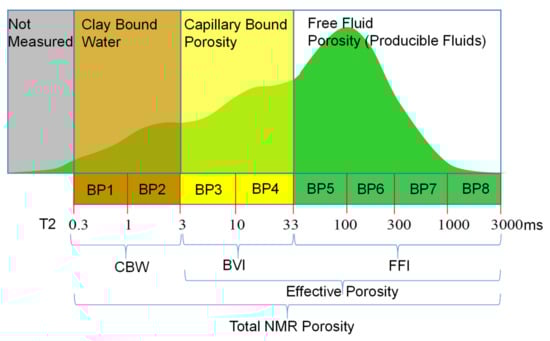 Protons associated with clay-bound water (CBW) and fluid in small pores display short T2, whereas fluid in larger pores shows longer T2 relaxation times. Generally, a T2 cutoff can be designated to distinguish between CBW, irreducible pore fluids or pores containing bound water (known as bulk volume irreducible, BVI), and producible fluids (known as the free fluid index, FFI) [,,]. The T2 cutoff can be determined experimentally from the comparison of NMR curves obtained for core samples at different saturation levels or assumed based on lithology [,,]. Generally, the T2 distribution is represented by a set of 8 bins porosities (BP1 to BP8) determined for a set of T2 cutoffs. For clastic rocks, the cutoffs shown in Figure 1 are generally used to determine the bin porosities and therefore different types of pore systems as below:
