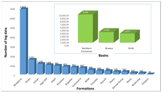 In this study, a large dataset from WA offshore basins was used to evaluate the performance of several ML methods to synthesize NMR logging tool outputs. A total of available 16,025 data points from 16 formations (Figure 2) with the age range of Permian to Tertiary were used. The data were collected from 14 wells with a complete set of CMR and conventional logs, such as Scarborough and Pluto wells. Wells are located within 3 main offshore basins of WA (Browse, Northern Carnarvon, and Perth Basins) with a depth range of from 1188 to 4138 meters (Table 1). All data were combined in one file and after randomizing, 80% of data (12,820 data points) were used for training purposes and 20% (3205 data points) as blind samples to check the ML performance.