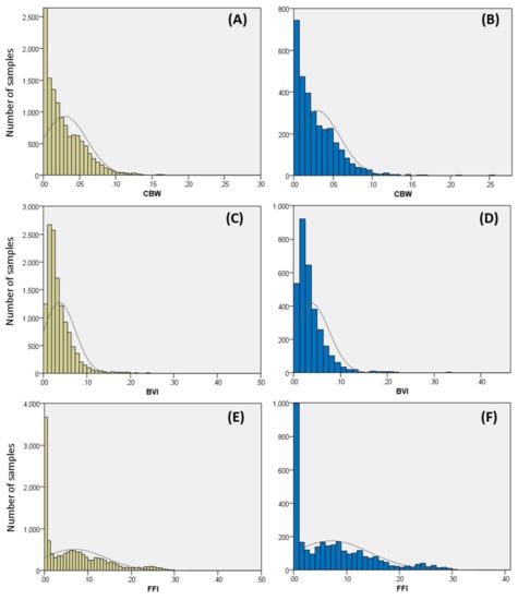 CBW, BVI, and FFI distribution in training (left histograms) and blind datasets (right histograms).
