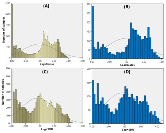 Distribution of the logarithm of Coates and SDR permeabilities in training (A,C) and blind (B,D) datasets.