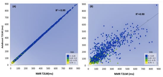 In conclusion, this study indicates that the AdaBoost model can be utilized to generate NMR log outputs with high accuracy from conventional logging tools for clastic rocks. Classification of data for rock types (based on shale content) and fluid types (liquid and gas content) is not that necessary and the ML model can pick up all patterns and can successfully predict the NMR log outputs.