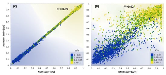 NMR log provides rock’s pore volumes based on the hydrogen content. Ignoring structural hydrogen, hydrogen within the chemical structure of minerals such as clays and gypsum, it generally exists in pore-filling fluids, such as water and hydrocarbons. Based on the NMR T2 cutoffs, three types of pore spaces can be detected by the NMR tool including CBW, BVI, and FFI. Clay bond water (CBW) is a layer(s) of water molecules that cover the surface of clay minerals, therefore, occupy part of the pore spaces. Clay particles generally have a negative charge at the surface. The accumulation of negative charges attracts cations and water molecules on the surface of clay particles known as CBW. CBW is strongly attached to the surface of clays and shows a low T2. In clastic rocks, pore spaces that occur between T2 values of 0.3 to 3.0 ms are considered CBW. Other studies by [,] indicates different cutoff values for shale reservoirs. The volume of CBW depends mostly on the type of clay, and pore water salinity. In well log interpretation, effective porosity is defined as total porosity minus CBW and there are different approaches to quantify CBW volume using Vsh. Figure 3A,B show CBW variations in the training and blind datasets. Adaboost both in training and blind datasets shows the best performance to predict CBW (Figure 4A,B) followed by RF, kNN, and ANN. Based on Pearson correlation the most influencing inputs to predict CBW in the order of importance are NPHI, Vsh, and DT. A confidence interval of 95% was used for the presentation of all results in this study.