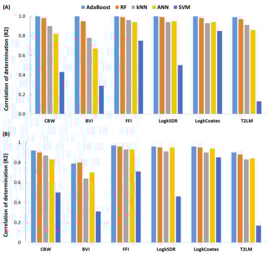Performance of different ML methods for prediction of NMR log outputs for training (A) and blind (B) datasets. The AdaBoost method performs the best for both training and blind datasets.