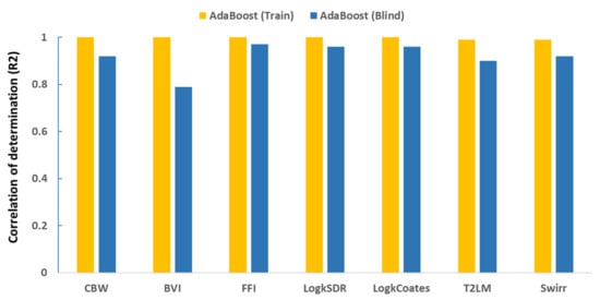 In most of the cases, RF, kNN, and ANN models respectively follow AdaBoost in their performance for both training and blind datasets. SVM model performs weakly to predict the targets of both training and blind datasets. In general, complex tree-based techniques such as AdaBoost and random forest worked the best for this purpose.