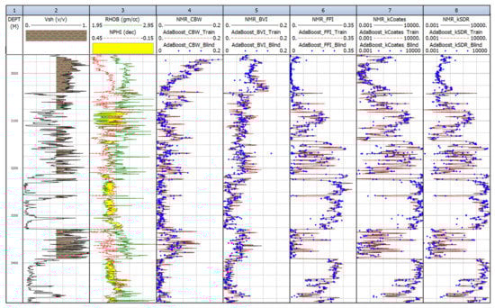 To better display the ability of ML methods in predicting NMR log outputs, especially the AdaBoot model, real and predicted NMR outputs are shown for Pluto 3ST1 well from Northern Carnarvon Basin (Figure 10). For this well, the same as the whole dataset, well logs were randomly divided as training and blind datasets to check the performance of the AdaBoost model for this borehole. As can be seen in Figure 10 the model successfully predicts NMR log outputs for both training and blind datasets.