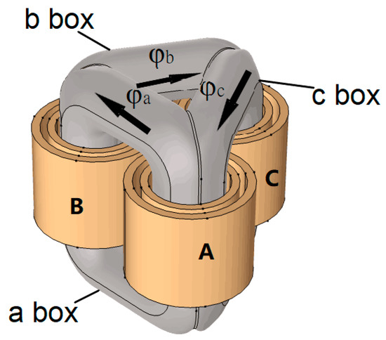 Assume that the magnetic flux flowing through the three independent frames of the three-dimensional wound core transformer is , and , respectively, in which frame a and frame c constitute the A phase center column, frame b and frame a constitute the B phase center column, and frame b and frame c constitute the C phase center column, as shown in Figure 1 [14]. A, B and C are both windings and the locations where the phase flux converges.