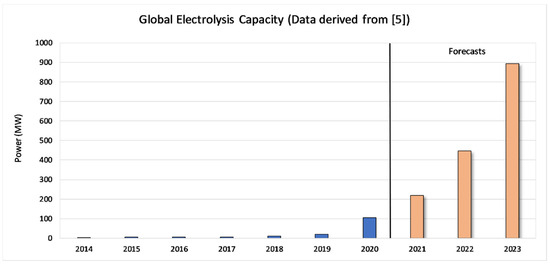 - Global Electrolysis Capacity Becoming Operational Annually, 2014–2023, Historical and Announced—Charts—Data & Statistics IEA. Available online: https://www.iea.org/data-and-statistics/charts/global-electrolysis-capacity-becoming-operational-annually-2014-2023-historical-and-announced (accessed on 13 July 2021).