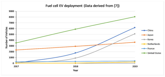 - Fuel Cell EV Deployment, 2017–2019, and National Targets for Selected Countries—Charts—Data & Statistics IEA. Available online: https://www.iea.org/data-and-statistics/charts/fuel-cell-ev-deployment-2017-2019-and-national-targets-for-selected-countries (accessed on 13 July 2021).