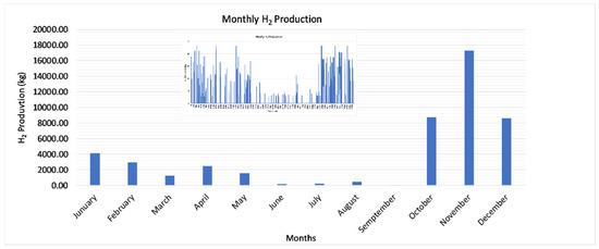In Figure 3, the monthly H2 production from the wind park’s energy surplus is depicted along with the hourly production pattern derived from the monthly data. The monthly production is used in the sizing procedure since the periods of high demand can be determined for adapting the capabilities of HRS providing a clear view regarding the supply capabilities of the station considering the FCEVs penetration scenarios. The operation of this type of system relies on the utilization of surplus electrical energy rejected by RES in an electrolysis system for the generation of H2 which can be stored in high-pressure tanks or metal hydride canisters for future use. Thus, seasonal demands on H2 could be covered when the overall H2 is insufficient (i.e., the period within June–September).