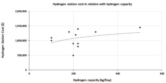 The economic criteria of an investment are the most significant for the discussion and the final decision. Additionally, the minimum size of the equipment required to efficiently service FCEV is another parameter discussed in this section. Isenstadt and Lutsey [23] state that most of the governments invest 2–3 Μ$; however, in their study, they concluded that the overall cost of HRS will drop to 1 M$ approximately. They estimate that the specific cost of H2 production fluctuates from 4 to 10 $/kg. Obviously, an increase in fuel demand affects the initial cost (see Figure 5), but it has the opposite result to specific costs. Additionally, some basic parameters that can cause cost reduction are the H2 market spread and technology evolution. Comparing this range of costs with the results of the current study, it can be concluded that the results are in good agreement with the results obtained by other researchers for most of the examined scenarios. The values of Figure 5 has been derived from the study [23].