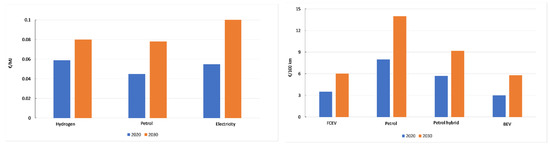 Fuel cost per 100 km for petrol vehicles, hybrid vehicles, EV, and FCEV in 2020–2030 [26].