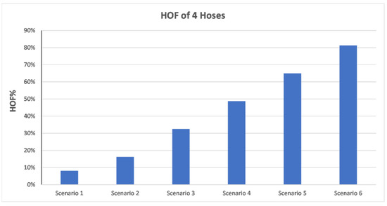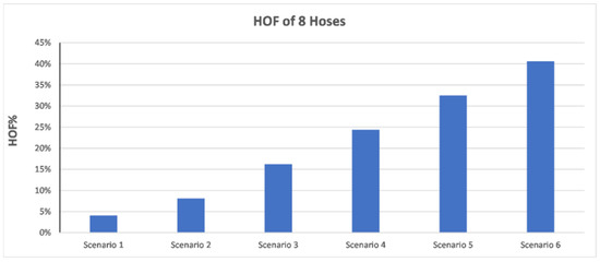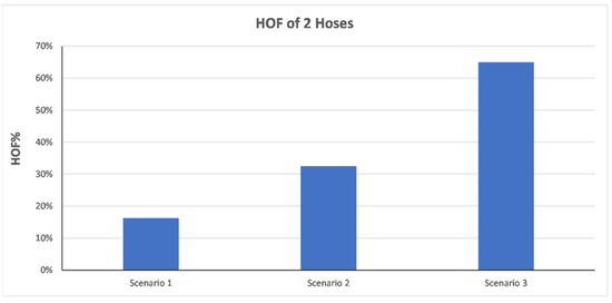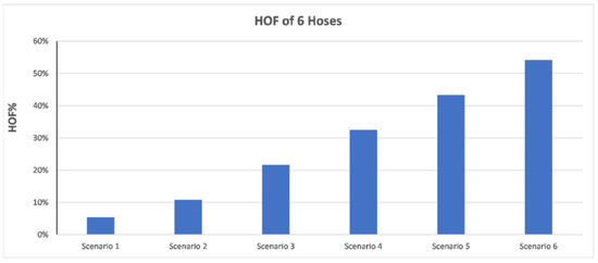 In Figure 8, the case with two dispensers for all six scenarios was examined. Nonetheless, the application of two dispensers seems to be an oversized solution for scenarios 1 and 2 since HOF is about 8% and 16%, respectively. In addition, scenario 3 presented an improvement reaching HOF around 30%, while scenario 4 presents HOF at 49%. Moreover, scenarios 5 and 6 present HOF at 65% and 81%, indicating that more dispensers are required.