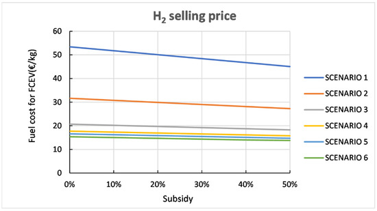 Considering the results of this research, Table 4 indicates the fluctuation of cost per 100 km among six scenarios. Focusing on scenarios 3–6, which will have capital growth, fuel costs are ~7 €/100 km (average). There is a considerable decline (~13% burden) when the average value of these scenarios is compared with 6.1 €/100 km [25]. Another parameter, which configures the weight of subsidization in the spread of H2 in Greece, is the cost/100 km which indicates the advantage of H2 compared to other conventional fossil fuels, especially in the remote rural regions. Even if the first discussion for HRS’s construction (LH2) in a remote Greek region seems to be profitable at some point (petrol: 14.8 €/100 km), more aspects should be considered, such as cost for vehicle owners. Thus, the role of the Greek government (consider an economic crisis) is to finance HRS construction and acquisition of FCEV (or reduce cost by another method) to motivate investors and habitants of remote regions.