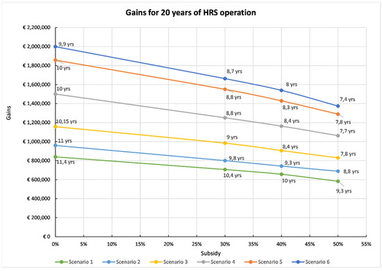 In this respect, and by considering both the sizing and economic results in Table 3 and Table 4, it is concluded that scenarios 1 and 2 are not economically viable even with 50% subsidy. Nevertheless, the subsidy is a vital prerequisite for constructing an HRS for the rest of the scenarios. One of the parameters that should be considered is the estimated FCEV number (or monthly demand), which is in function with HR’s size, cost, and income. More specifically, when the number of FCEVs increases, so does the specific cost. Thus, it is concluded that HRS should supply a higher number of FCEVs to reduce overall costs. In this sense, the same results are ascertained regarding the rest parameters of the economic model. For example, in scenario 6, in all four subsidy cases, the payback period presents better values than the rest scenarios. In addition, the profit ratio has higher values (equal or above 1) in the cases presenting increased FCEVs penetration. Thus, the economic parameters indicate that high FCEV penetration is necessary to achieve an efficient and economically viable HRS.