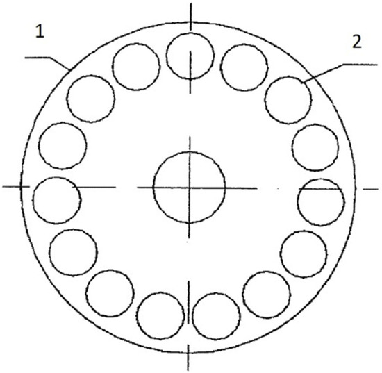 The impeller of the cavitation inducer has a cylindrical shape with a diameter of approximately 200 mm, and the same height. In the impeller, parallel to its axis, round openings were drilled, with a diameter of approximately 30 mm each. The openings were evenly distributed on the circumference. A schematic drawing of the applied cavitation inducer impeller is presented in Figure 1.