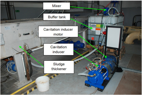 The experiment was carried out over a period of 12 months in a full-scale wastewater treatment plant (Poland). Sludge subject to disintegration was collected from the thickening tank, and first directed to the buffer tank equipped with a mixer. From the buffer tank, the sludge was transferred to the cavitation inducer. After passing through the cavitation inducer, it was again transferred to the buffer tank, from there back to the thickening tank, and further to the anaerobic digestion chamber. Such a system provided greater control and flexibility in the determination of the share of disintegrated sludge and unitary values of energy used in the process. The view of the cavitation inducer installed in a wastewater treatment plant is presented in Figure 2.