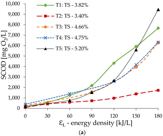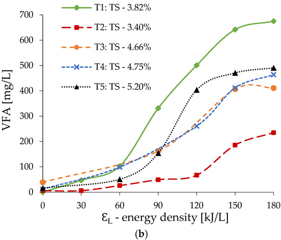 The most commonly used indicator for evaluating the release of organic compounds from activated sludge flocs is soluble COD. An increase in this indicator suggests conversion of the solid phase to the soluble phase, resulting in an increase in sludge bioavailability, and it may consequently result in increased biogas production in the anaerobic digestion process. Changes in the SCOD value and VFA concentration depending on the energy density at which the disintegration process was conducted are shown in Figure 3. The obtained data suggest that in all performed disintegration batch tests, an increase in εL was accompanied by more and more organic compounds released from waste activated sludge, as evidenced by an increase in the SCOD value. Some of these compounds were VFA. However, the intensity of VFA generation significantly decreased when a certain value of εL was exceeded. For T1, T2, T3, and T4, this phenomenon was observed after an increase in εL over 150 kJ/L; in T5 for εL > 120 kJ/L. Figure 3 also shows that SCOD and VFA concentrations for all the analysed εL were significantly lower in test T2 than in the other tests. It was highly likely to be caused by a low concentration of TS in sludge subject to disintegration in T2 in comparison to other tests. The effect of different solids concentrations on SCOD release, resulting from ultrasonication, was evaluated by Pilli et al. [18]. The cited authors determined that an increase in the solids concentration of waste activated sludge from 20.0 to 30.0 and 40.0 g TS/L caused a 1.33- and 1.37-fold increase in SCOD, respectively.